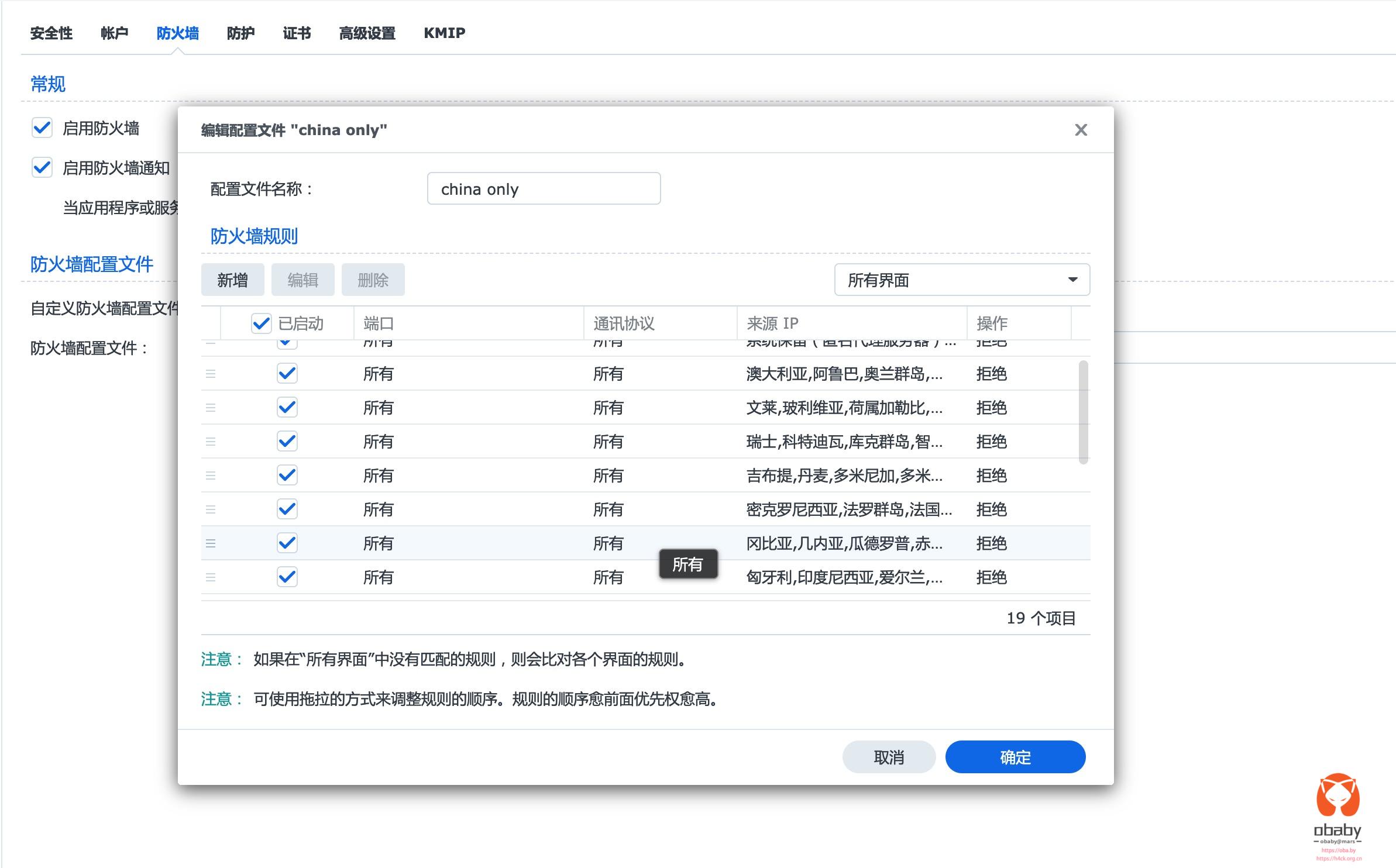 仅仅开了不到一天的时间就如此,这扫描也是无缝不入。虽然群晖自带防火墙,但是每次添加规则只能添加 15 个。这逻辑也是服了。 为了屏蔽国外的这些扫描器,只好添加一堆规则: