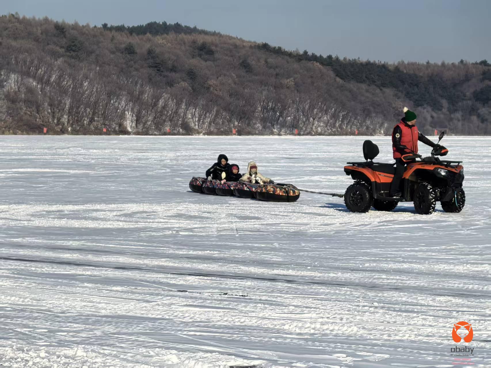 公园里,漫山遍野白雪,压在松枝上,的确冬天的景象。在老家,少能见到这种景象。湖面上有四驱车拉着雪圈转圈,这个我的确不喜欢,宝子自己去转的,50块钱。
