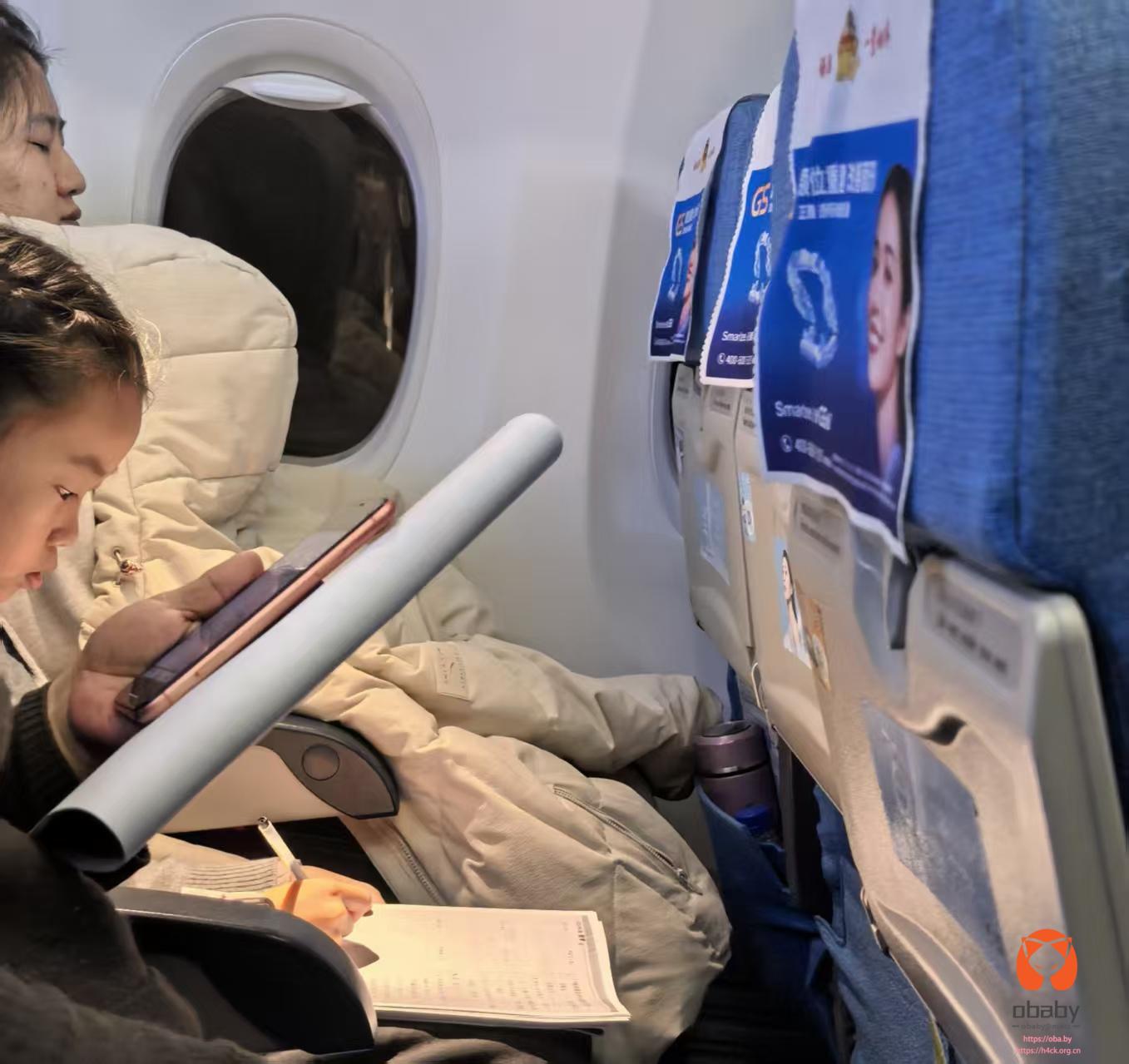 给宝子拍了一张写作业的照片,旁边的姐妹也给宝子排了一张写作业的照片。这,在飞机上赶作业的小朋友的确不多吧。